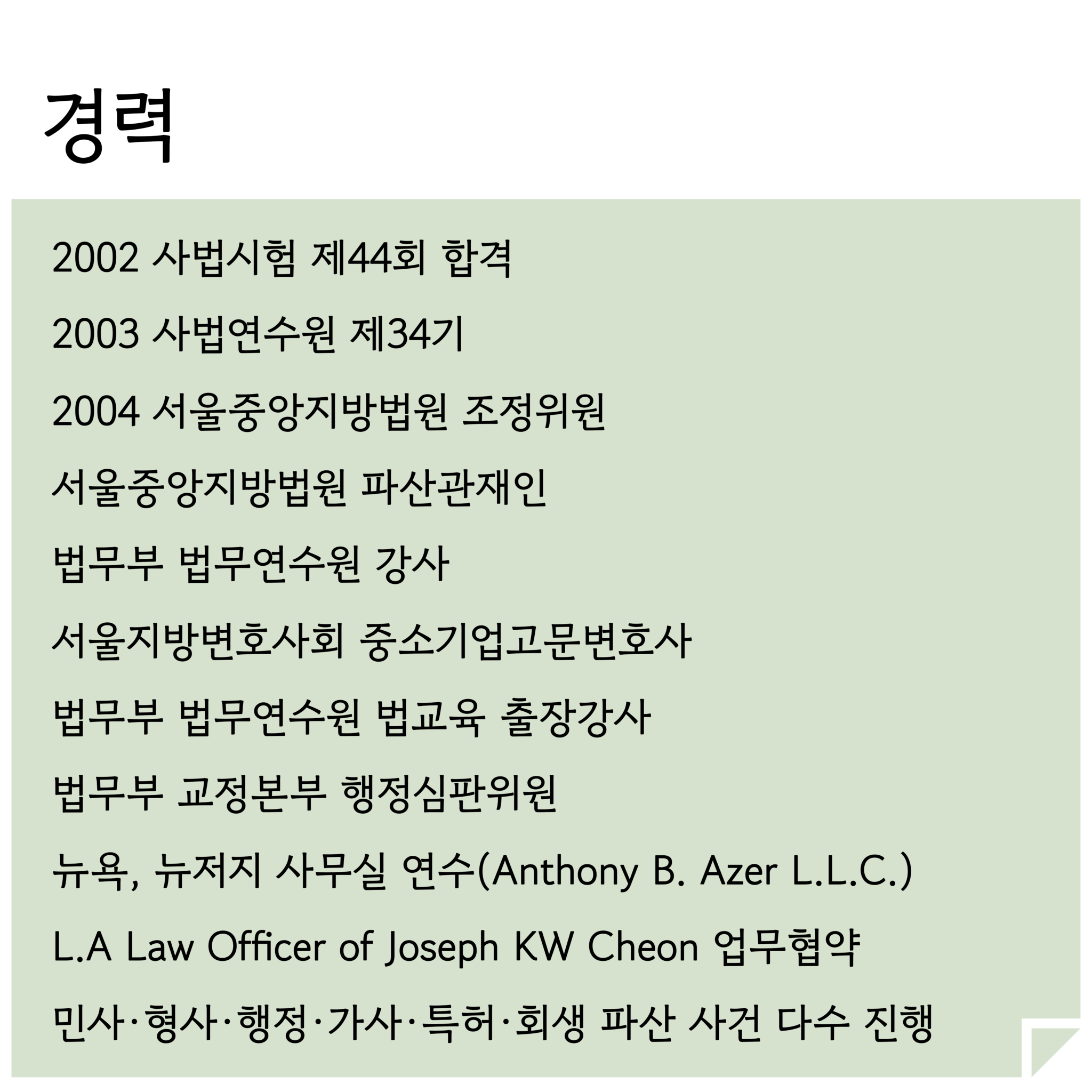 저희는 법률 금융 재무 구조 개선 분야에서 뛰어난 역량을 가지고 있는 구성원들로 이루어진 사무실입니다. 민사, 형사, 부동산, 건설, 조세, 금융 분야부터 기업소송, 법률계약 및 법인회생이라는 다년간의 경험을 바탕으로 조세 업무대리를 위한 세무기장까지 상시적인 기업활동을 자문하는 계약서 검토 및 경영 어드바이스까지 원스톱 토탈 법률 조세 서비스를 위하여 최선을 다하고 있습니다. 고객의 필요에 맞는 최선의 방법을 제공해 주기 위하여 항상 함께 하겠습니다.
